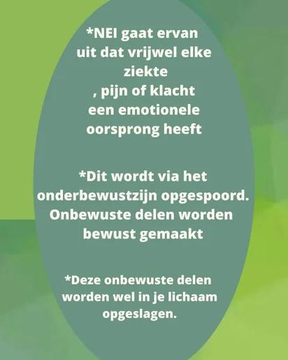 Holistische NEI-therapie kijkt naar het geheel van lichaam, geest en ziel. Met behulp van een pendel en biotensor wordt contact gemaakt met het onderbewuste om blokkades op fysiek, emotioneel, biochemisch en spiritueel niveau op te sporen en te behandelen.