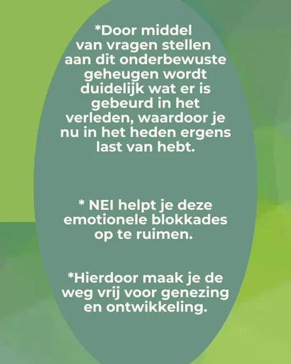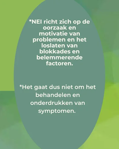 Je gaat naar de oorzaak van je klachten en herstelt de balans. Oude patronen laat je los, waardoor symptomen zoals fysieke, emotionele, mentale en energetische klachten verdwijnen. Lange praatsessies zijn niet nodig. Ook herbeleving van trauma’s hoeft niet. De kracht van NEI is dan ook dat je snel tot de kern van het probleem komt.
